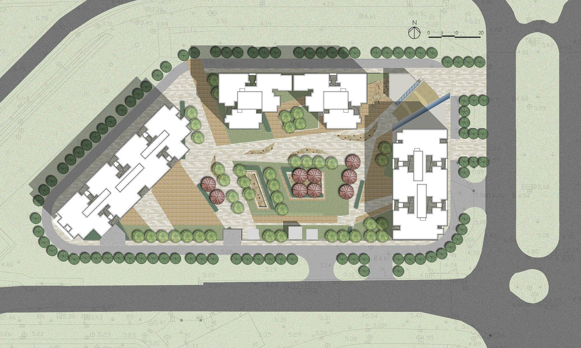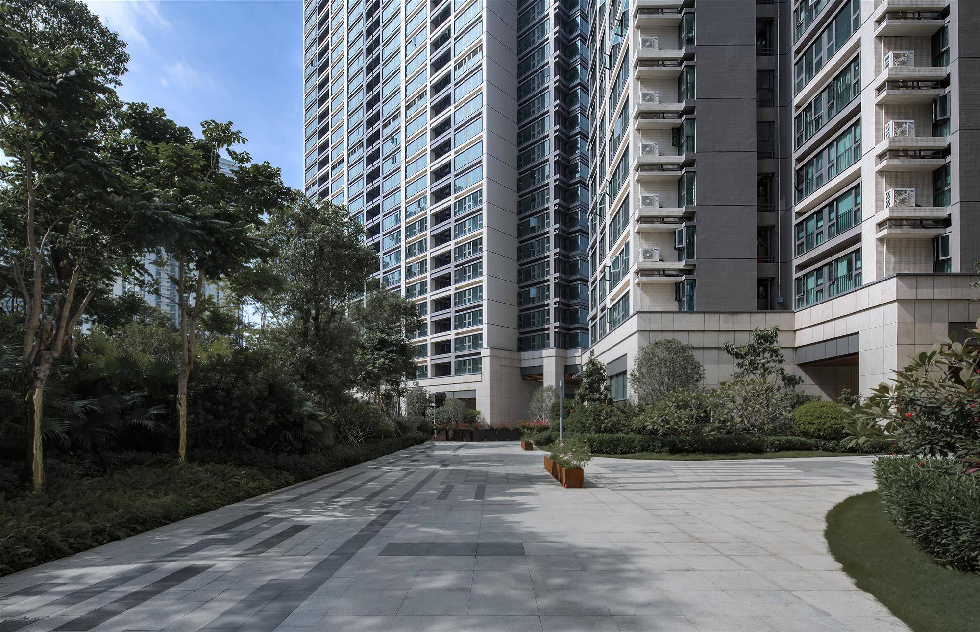 规考虑到用地狭小,深圳金领假日公寓顺应早期皇御苑社区规划肌理,在规划布局上打破长板布局,优先与南侧住区最大限度拉开间距,给城区提供喘息空间,保障区域阳光和通风,同时贴近北侧中心公园色,令住区以山脊之势同享南北两侧景色。3 栋塔楼建筑组群围绕南侧庭院呈半围合式布局,尽全力保留公庭院的完整和无干扰,形成合理楼距,将街角退让给城市,整体创造丰富的城市界面。